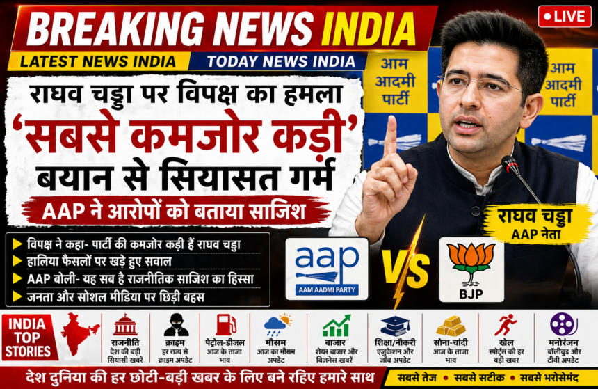 देश की राजनीति में एक बार फिर बयानबाज़ी का दौर तेज हो गया है।India Top Stories में Raghav Chadha को लेकर बड़ा विवाद सामने आया है। विरोधियों ने तंज कसते हुए कहा है कि उन्होंने कोई पार्टी जॉइन नहीं की, लेकिन उनकी भूमिका को “सबसे कमजोर कड़ी” बताते हुए हमला बोला है। इसके बाद सियासी माहौल गरमा गया है और अलग-अलग दलों के बीच आरोप-प्रत्यारोप शुरू हो गए हैं।